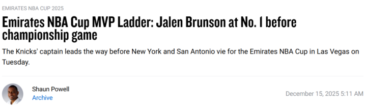 | 北京时间12月15日,NBA官网公布了杯赛MVP的最后一期实力榜。如今杯赛将进入决赛阶段,尼克斯和马刺将决出冠军的归属。按照赛事的一贯规律,凡是能助力球队夺冠且表现极为出色的球员,最终必将捧起MVP奖杯。这份荣誉的归属,将在尼克斯与马刺这两支晋级决赛的球队之间产生——两队阵中都不乏具备杯赛MVP竞争力的球员。